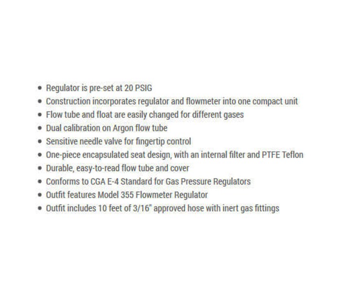 • Kit includes 10 feet of 3/16″ approved hose with inert gas fittings